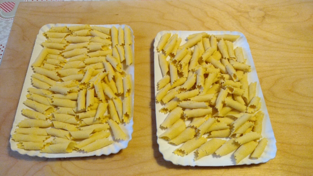 In una spianatoia adagiare la farina, formare un incavo al centro e sbattere all’interno due uova con l’olio. Iniziare ad amalgamare il tutto e aggiungere un po’ d’acqua se necessario per realizzare un panetto sodo, omogeneo e leggermente umido. Questo garantirà una lavorazione della sfoglia più agevole soprattutto nel caso di lavorazioni che richiedano tempo (garganelli, pasta ripiena, spaghetti, tagliatelle ecc…)