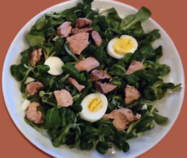 FEGATO DI MERLUZZO al naturale San Poteto in insalata mista con pomodorini, cetrioli, fagiolini, olive nere, uovo sodo, olio extravergine di oliva (ingredienti a piacere).