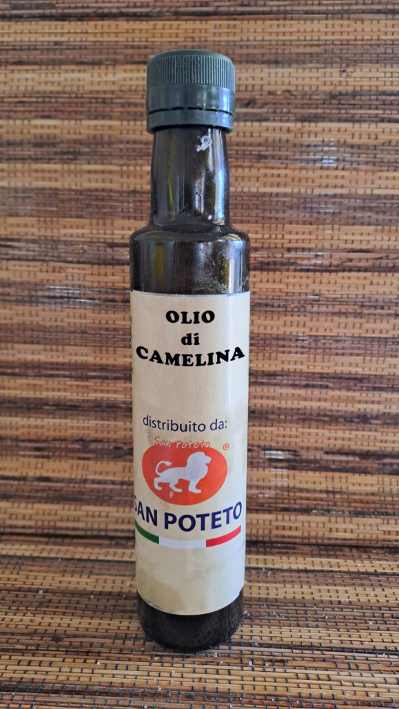 Si ottiene dalla spremitura, a freddo, dei semi di Camelina, colore giallo oro, odore caratteristico di verdura.